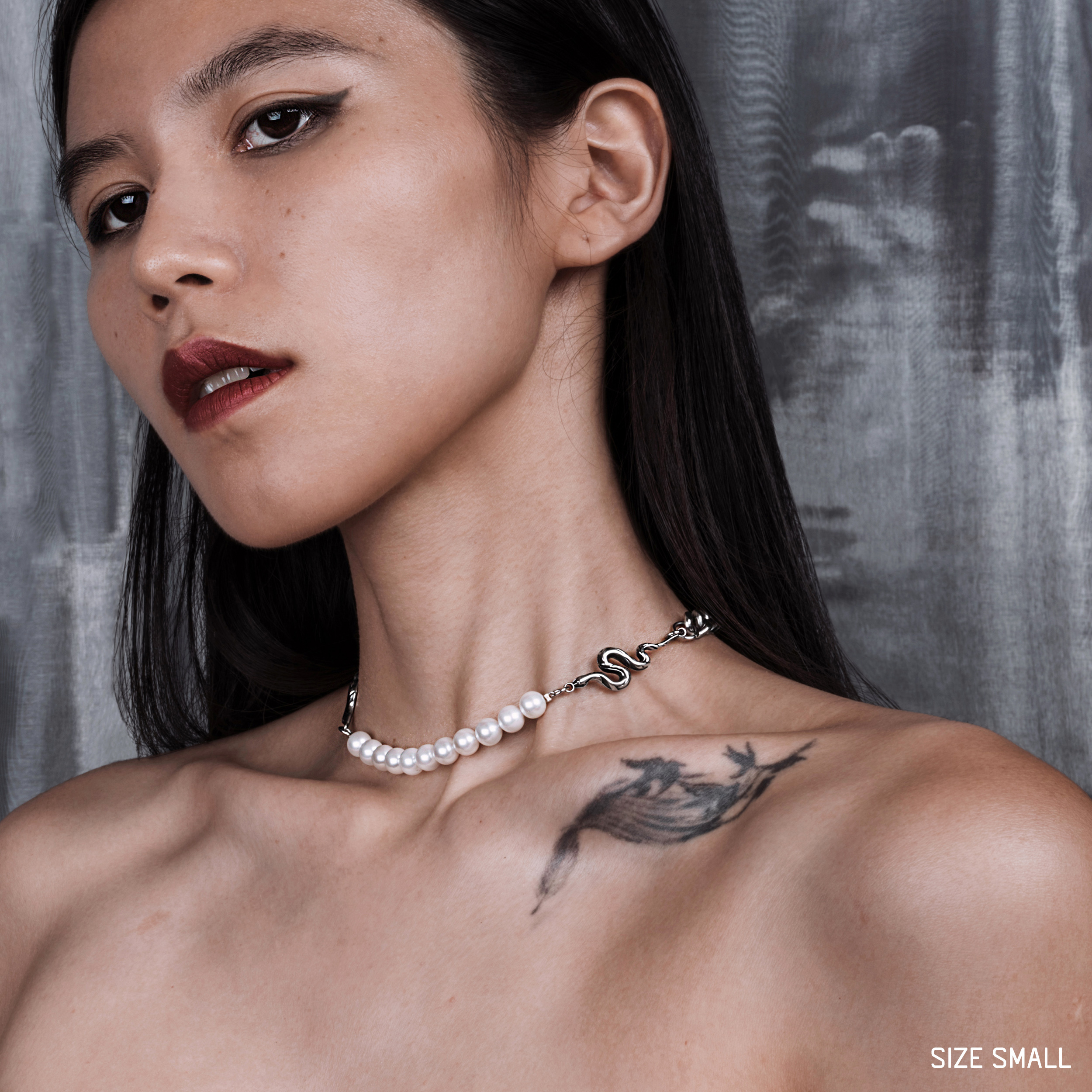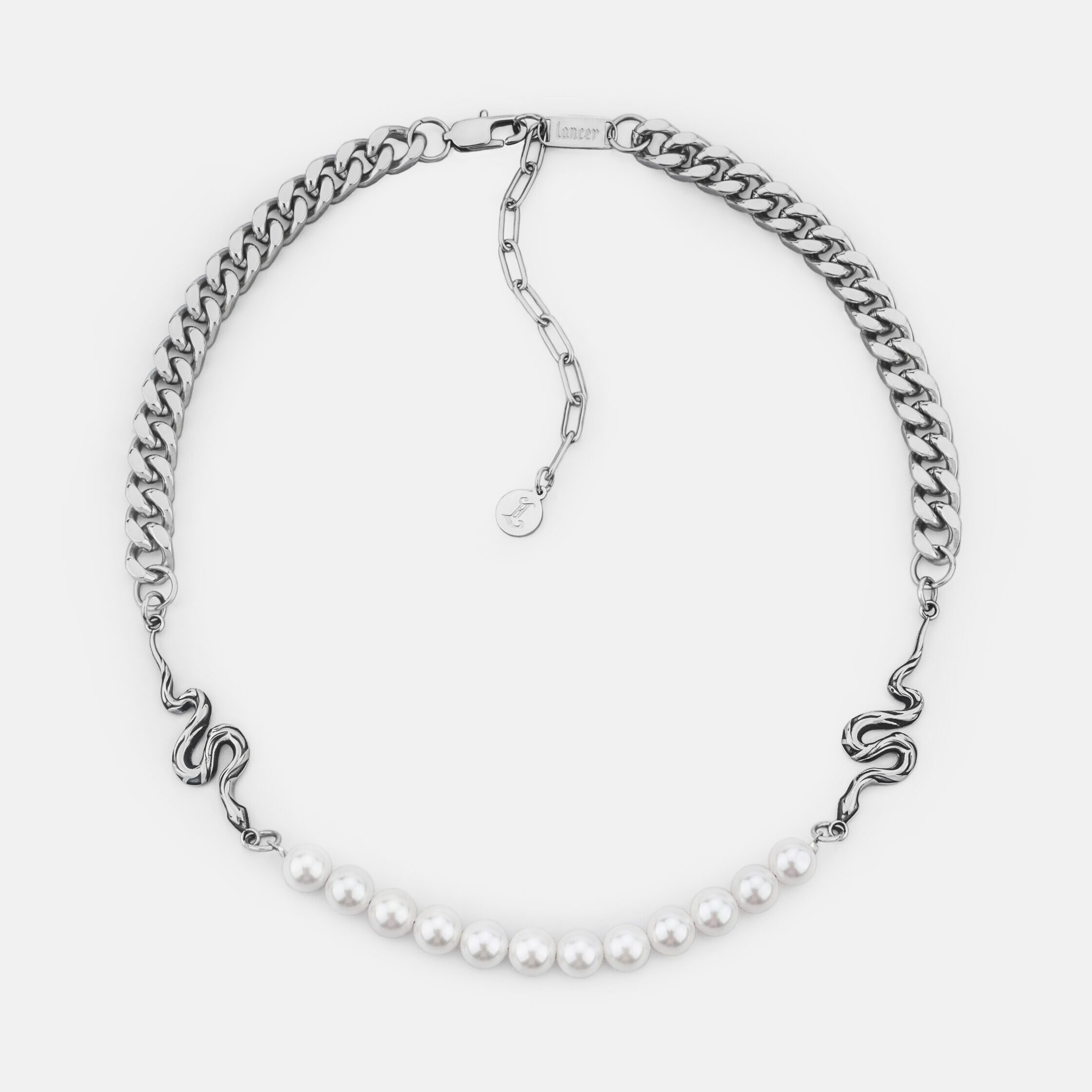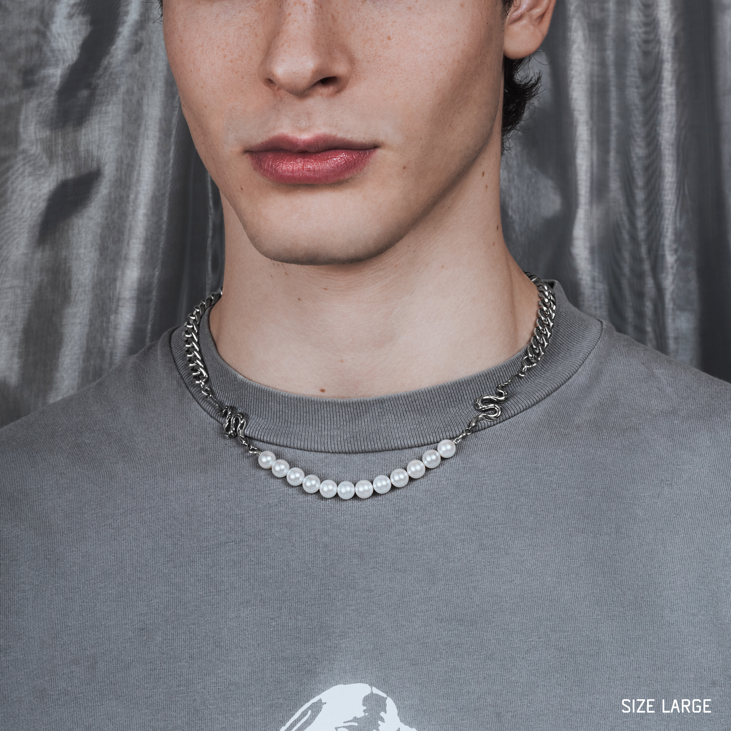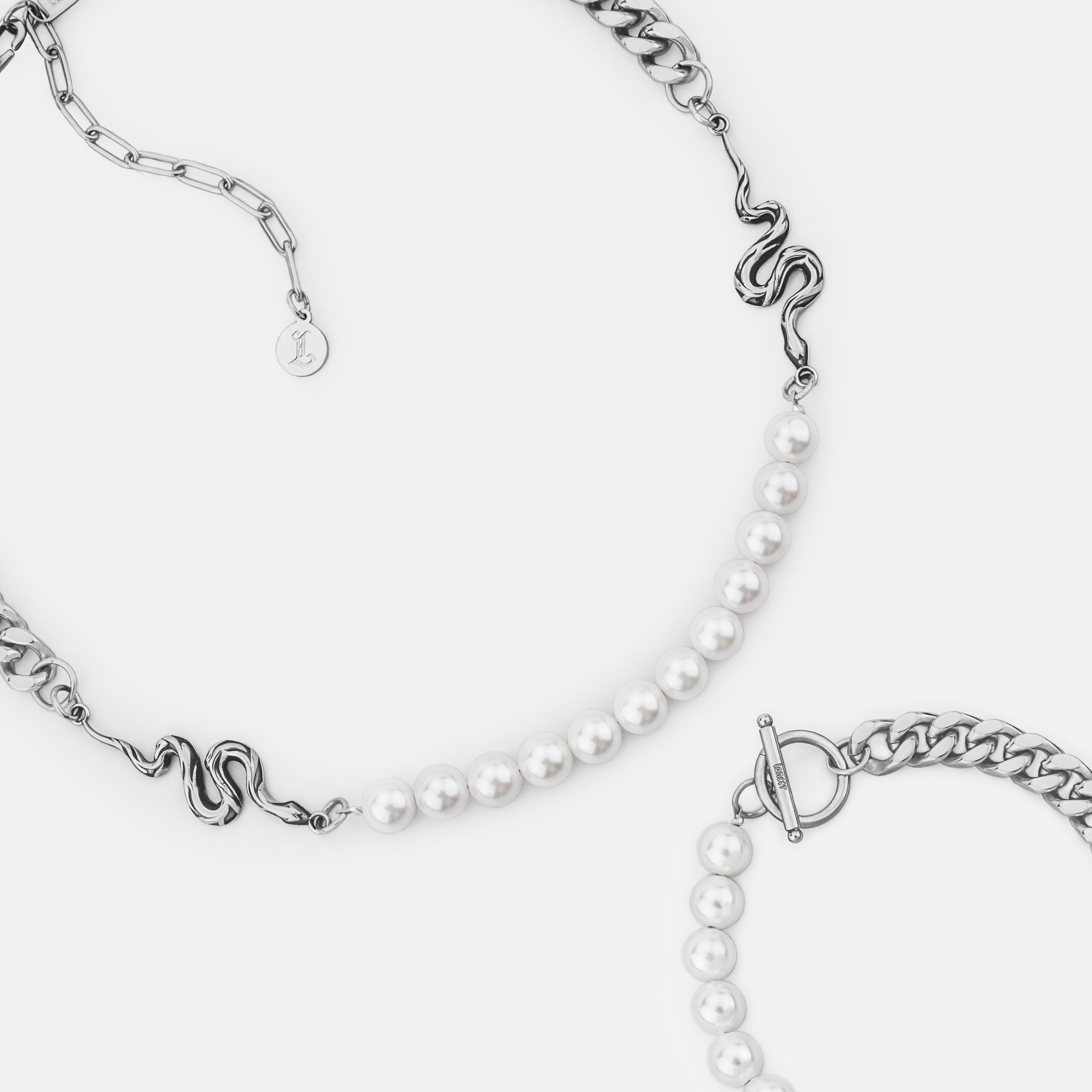 Finding balance through the connection of contrasting elements, both our chain Lure and bracelet Fusion juxtapose shimmering shell pearls with industrial cuban links, flaunting the perfect combination of classic and modern.