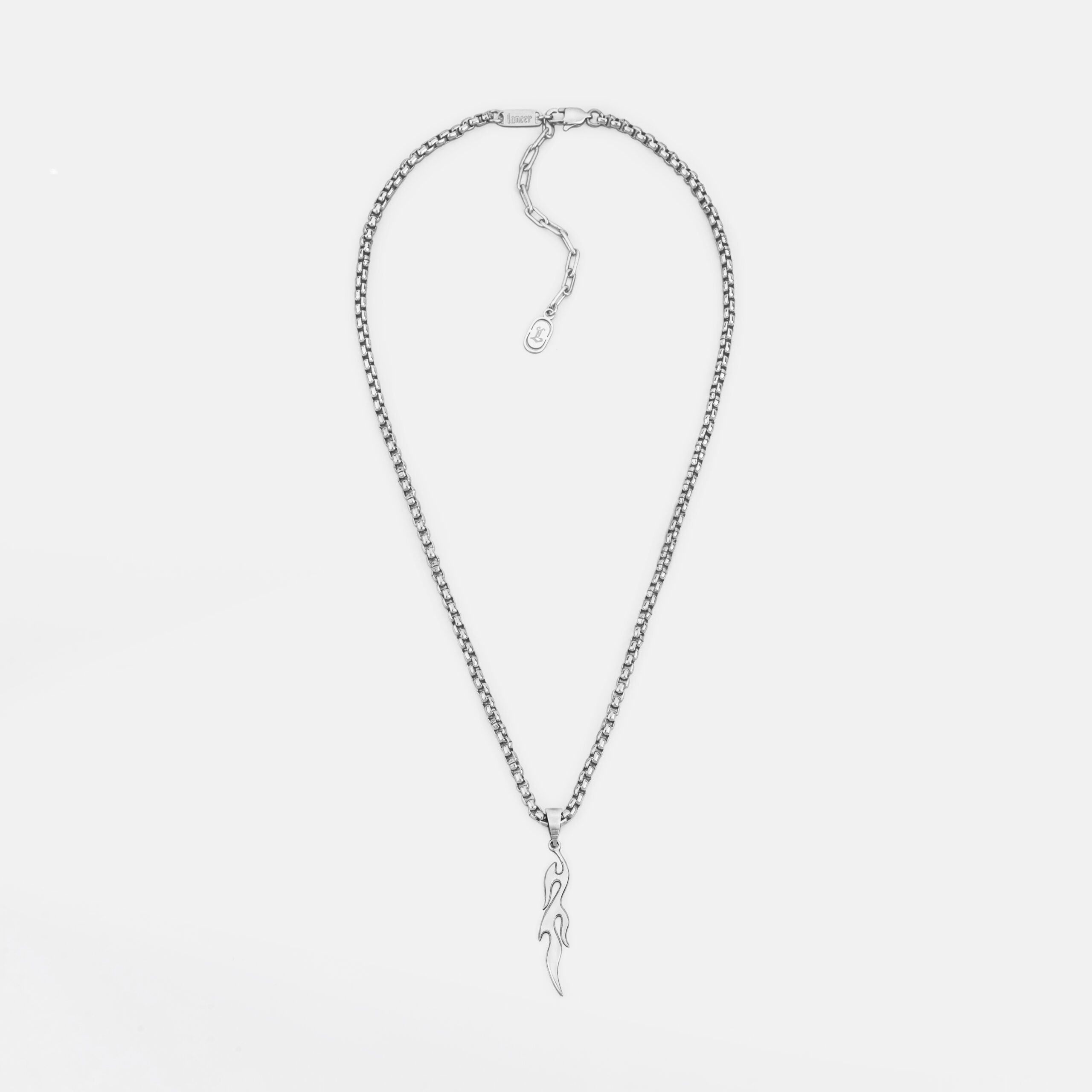 Comes on a matching 3.5mm rounded box chain with adjustable length. LANCER wordmark logo on the custom logo tag and letterform logo “L” on the extender chain charm.