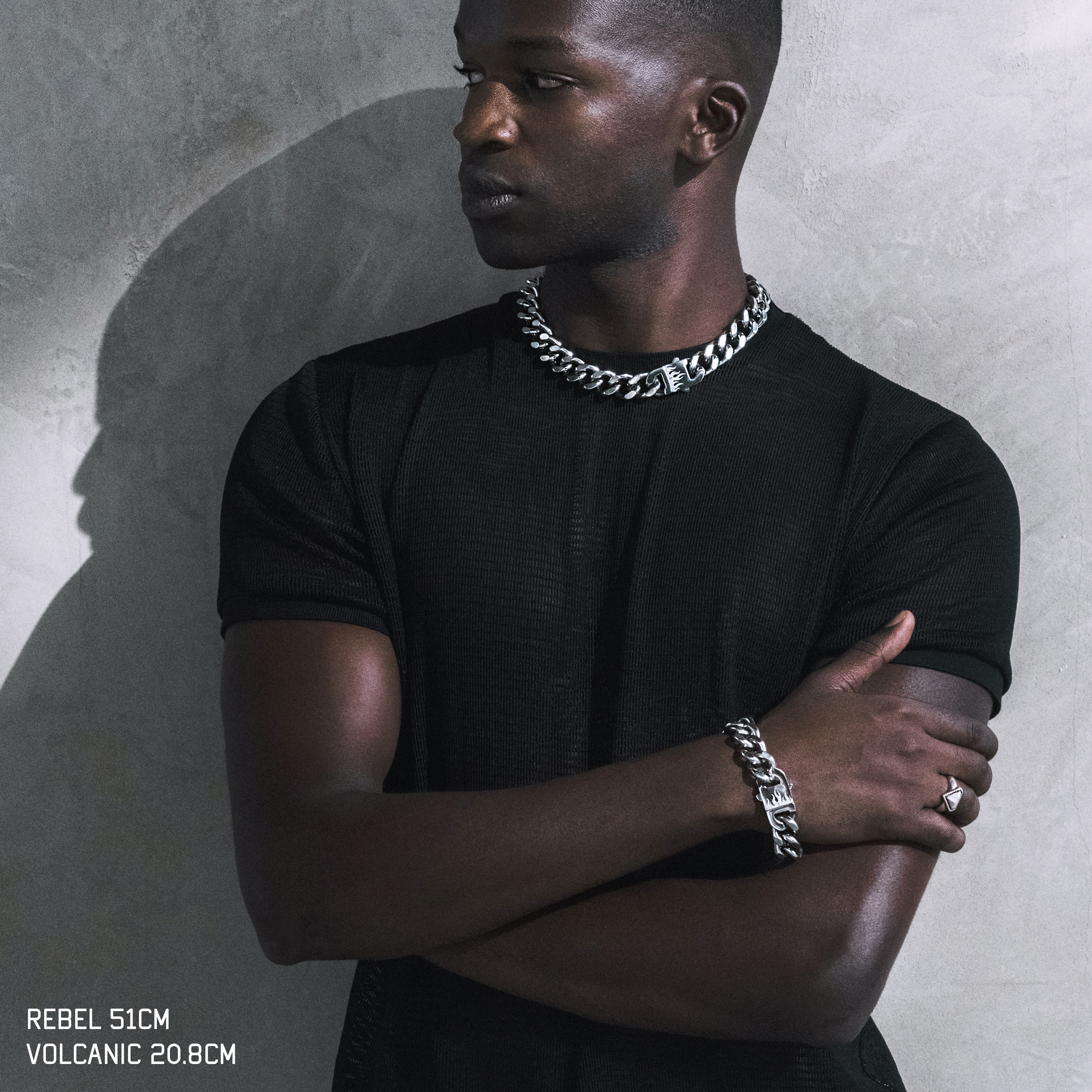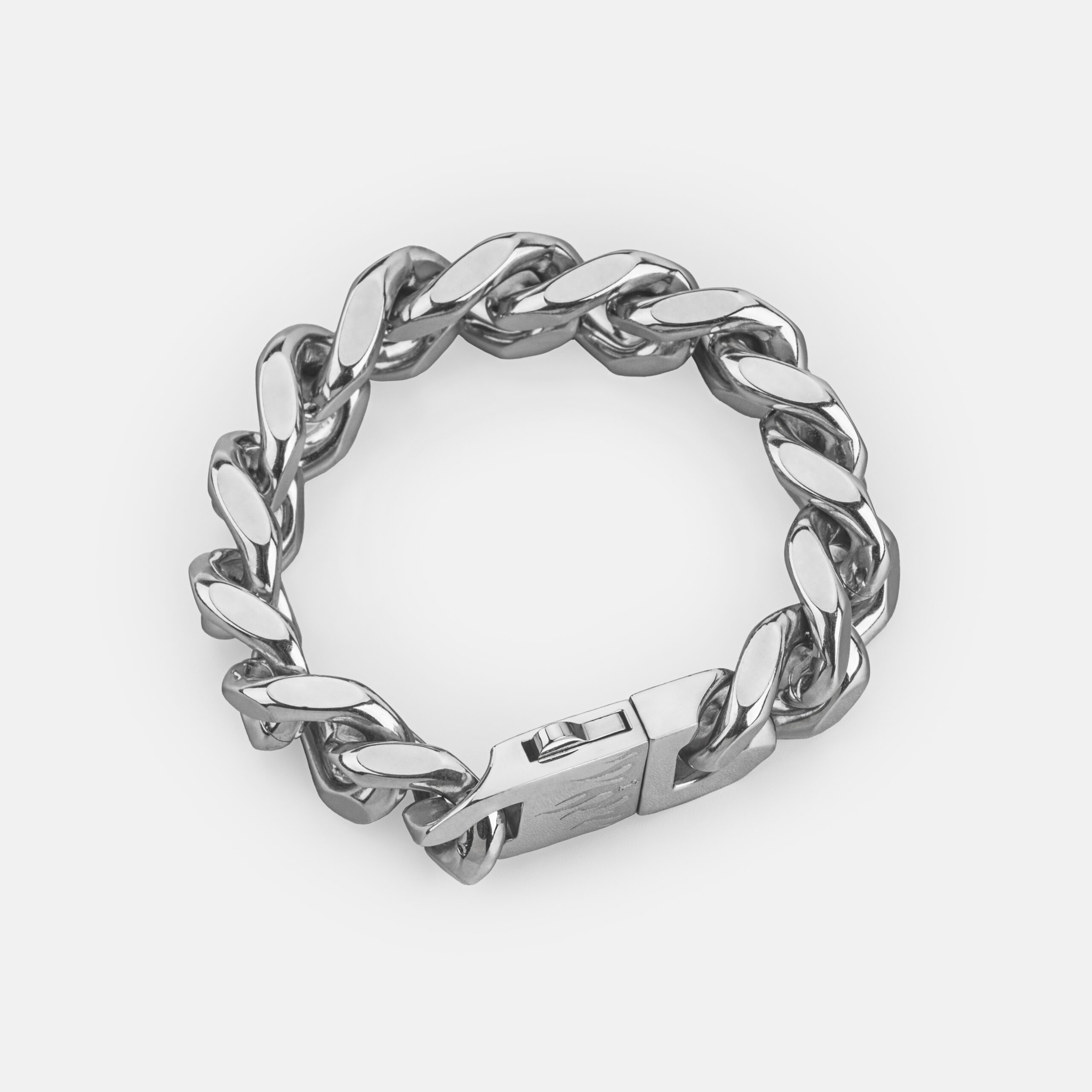 The Volcanic is the bracelet version of our signature choker chain Rebel. Designed to make a bold statement, this heavy-duty bracelet features a substantial 16mm-wide cuban link and a sturdy buckle clasp marked by an engraved original flame pattern and our signature letterform logo “L”, putting a new spin on a well-worn design.